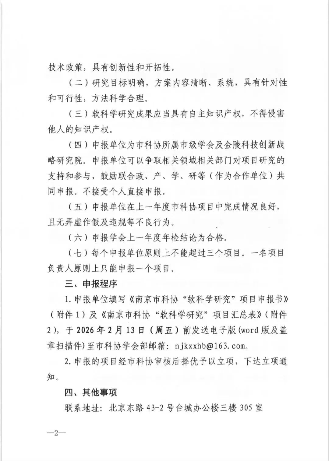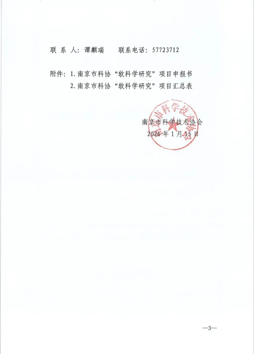 为履行为市委、市政府科学决策服务职责,建设具有南京 特色高水平科技创新智库,南京自然医学会根据《南京市科协软科学研究项目 管理办法》(宁科协〔2025〕11 号),开展“软科学研究”项目。现将相关要求通知如下: