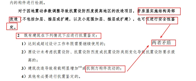 答:不矛盾,上面的是针对地震抗震设防烈度提高区域且满足结构局部改造的情况。下面这种情况,抗侧力构件改动(拆除或新增框架梁或框架柱、承重墙等)后,已经不满足结构局部改造的要求了。