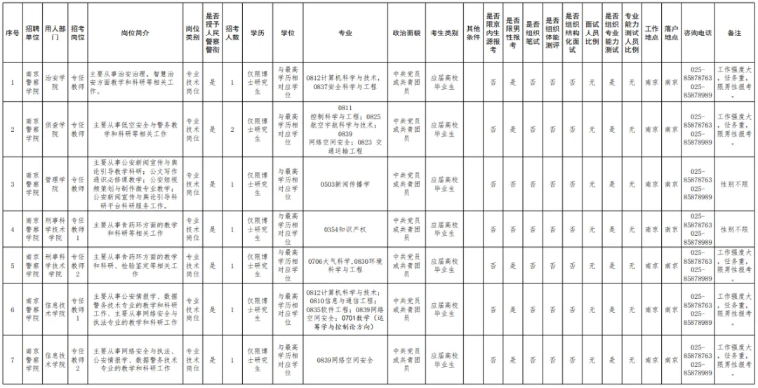 本次招聘共设置10个职位、招聘11人,具体职位信息及资格条件详见《南京警察学院2026年度公开招聘计划表》(见附件1)。