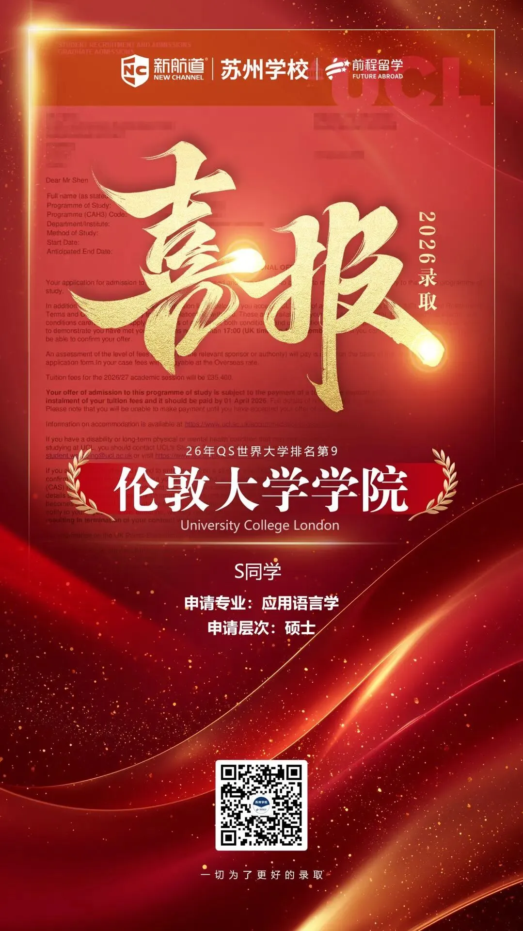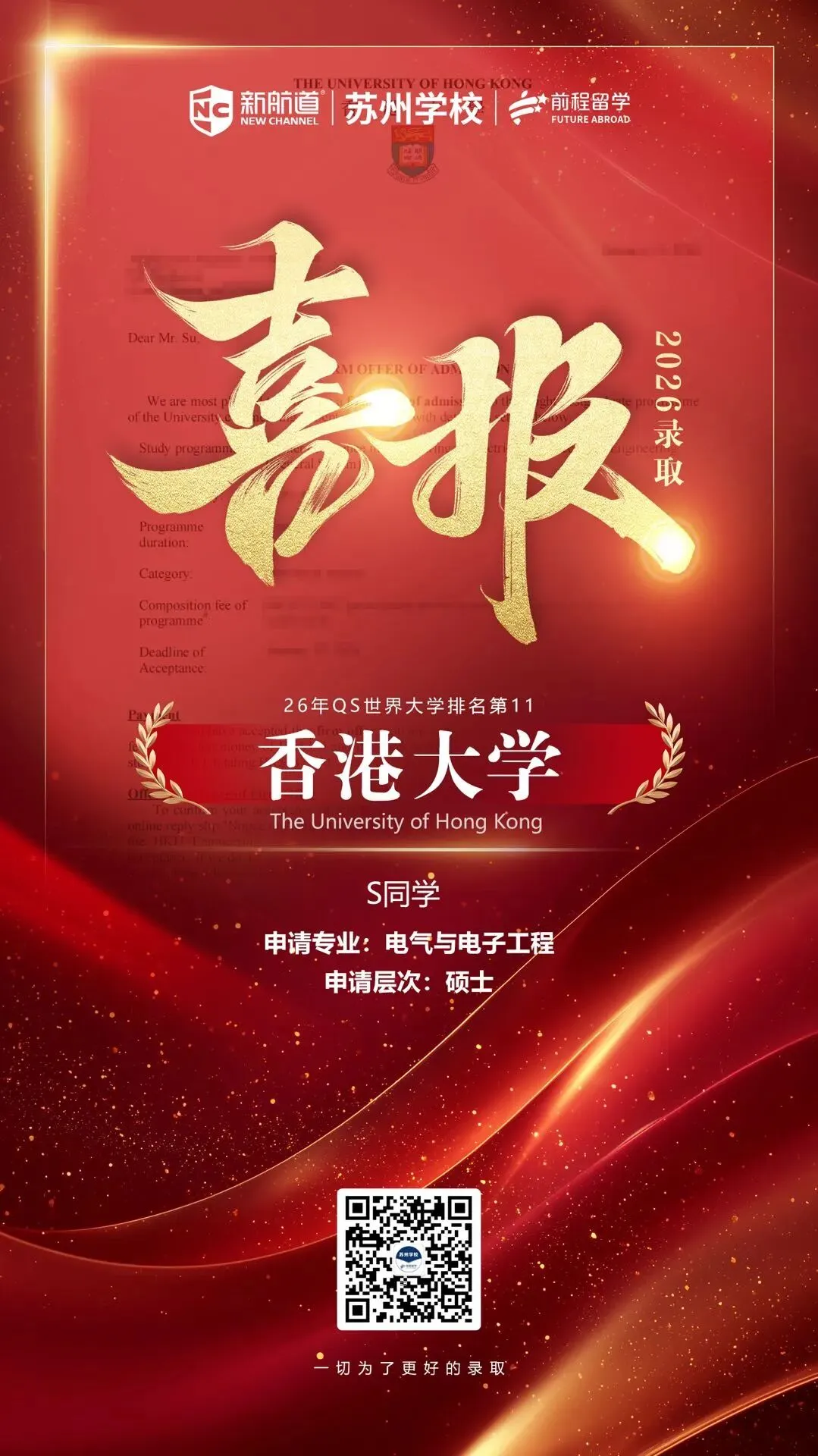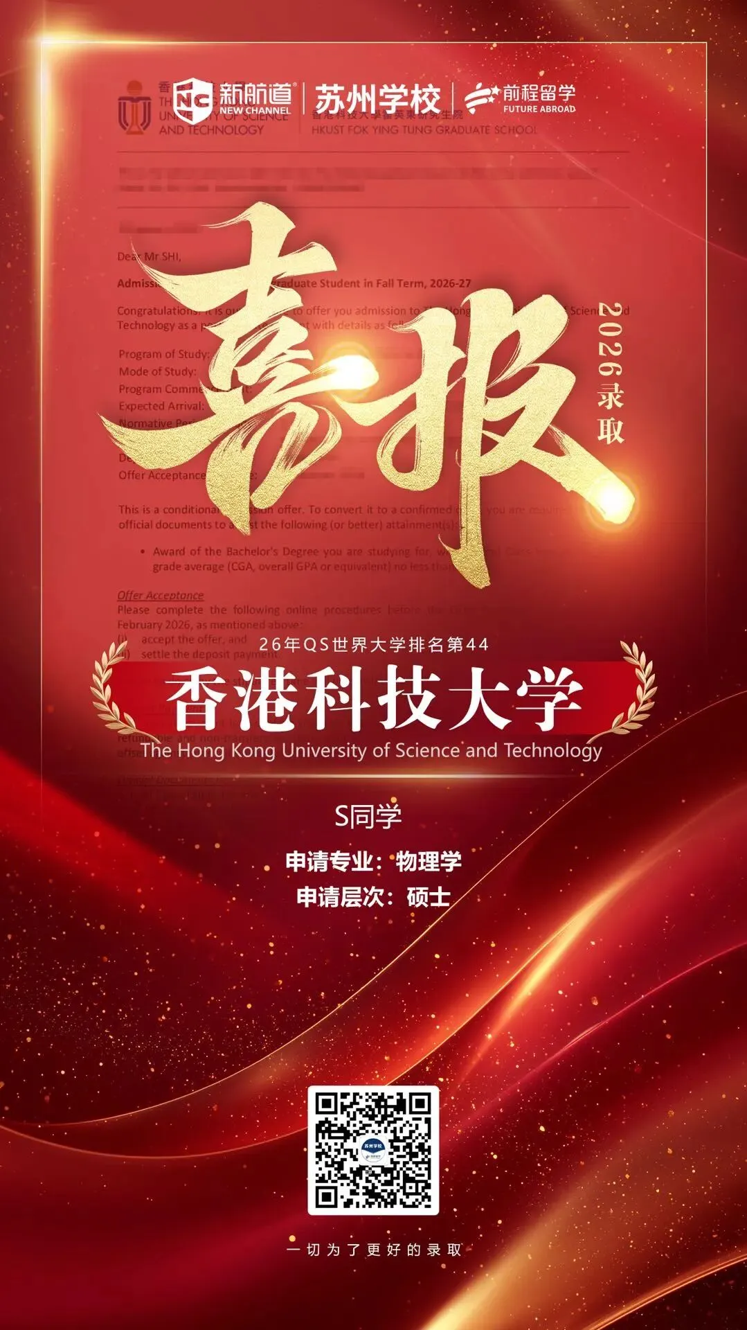 近日,苏州新航道学员在2026fall申请季中表现惊艳——硕士申请实现“8连中”,一举收获中国香港科技大学、香港大学、伦敦大学学院等世界顶尖院校录取!