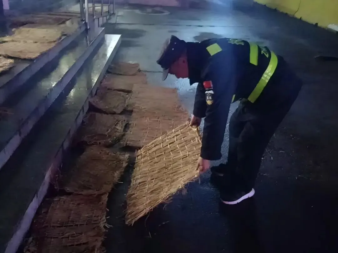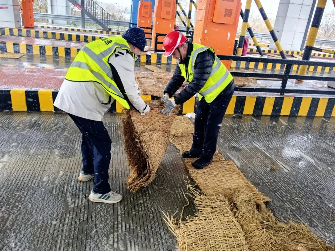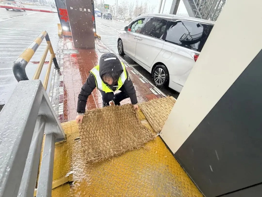 20日清晨,天色未明,各收费站、服务区已是一派忙碌景象。工作人员赶在车流高峰到来前,对站区广场、车道、坡道等易滑区域进行全面防滑处置。一捆捆草垫被迅速铺设开来,化为司乘人员脚下踏实安稳的“防滑垫”。服务区同步加强巡查与值守,及时补充防滑物资,并通过温馨广播与现场提示,不断传递“减速慢行、小心地滑”的关切提醒,为寒日清晨的出行增添暖意。