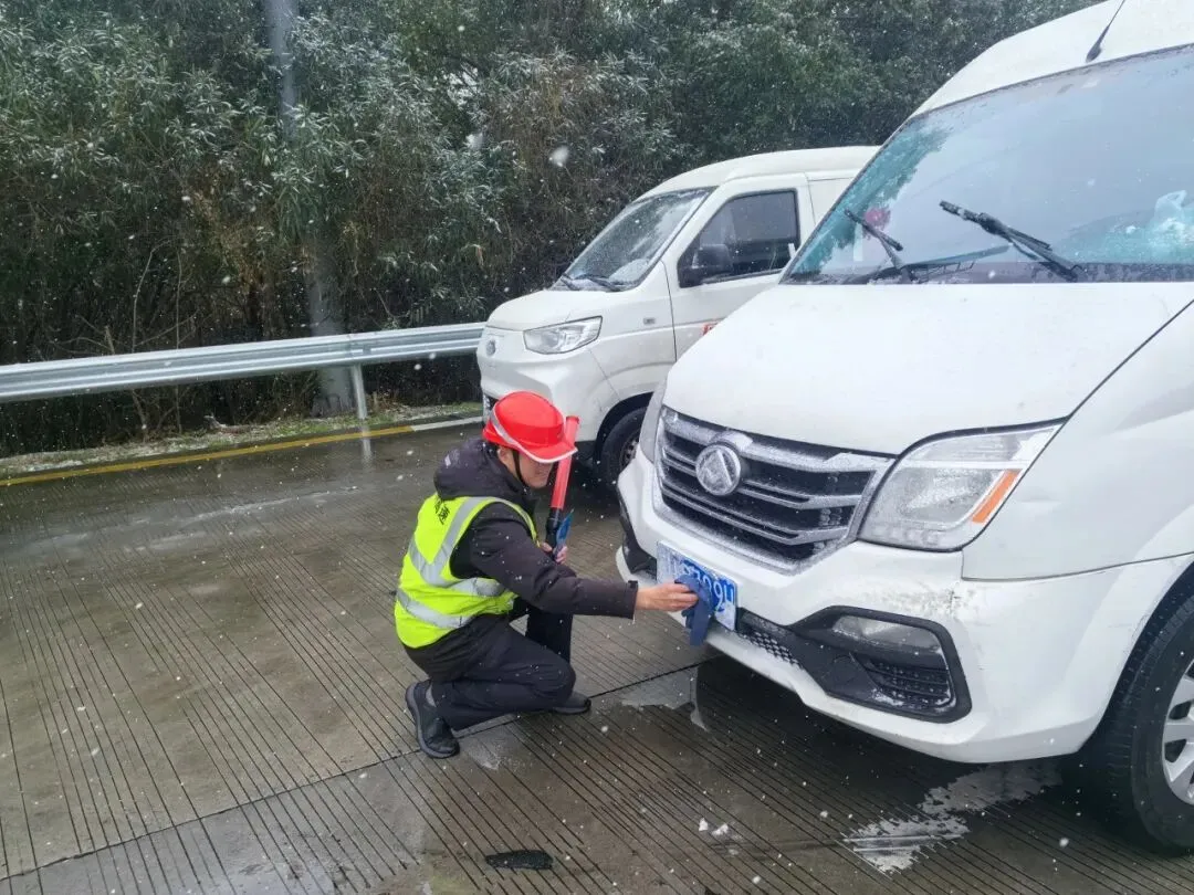 早高峰时段,随着由北向南车流增多,积雪覆盖车牌导致系统自动识别失效的情况偶有发生,影响通行效率。苏州高速全线收费站工作人员见状,立即主动上前,化身“清雪服务员”,手持工具俯身耐心为车辆清理车牌积雪。这一主动、细致的举手之劳,有效提升了道口通行效率,也赢得了过往驾乘人员的连连好评,成为风雪旅途中的一道暖心风景。