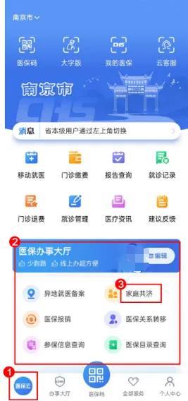 1.打开“江苏医保云”APP,可通过以下三种方式找到【家庭共济】页面: