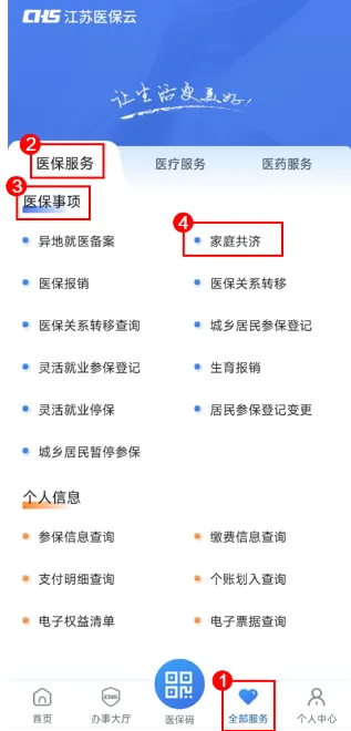 方式一:在“江苏医保云”APP的【首页】,下划找到【医保办事大厅】下方的【家庭共济】即可点击进入。