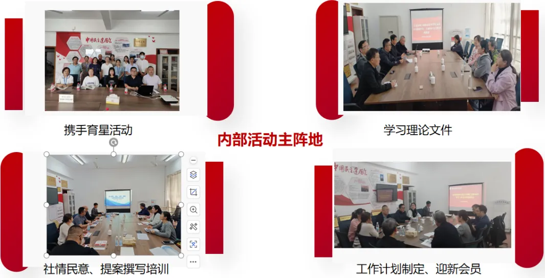 荣誉展示区:设立荣誉墙集中展示支部及会员获得的各项表彰,包括市级“示范支部”奖牌、省民建“特色基层组织”证书,以及历年基层组织会务工作先进集体、参政议政先进集体、新闻宣传工作先进集体“一等奖”证书等,发挥榜样引领作用。