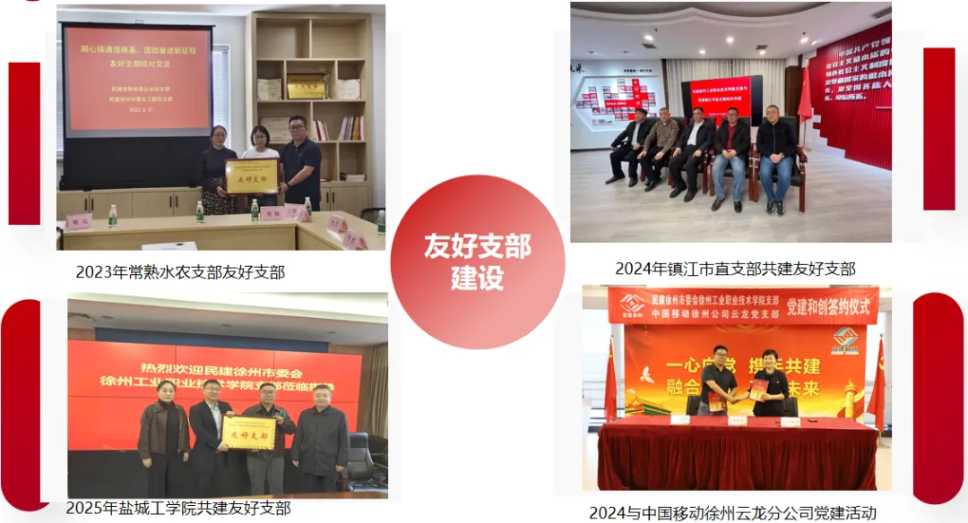 缔结“友好支部”、开展多维共建:支部先后与民建常熟水农支部、镇江市直支部、盐城工学院支部等缔结“友好支部”,与中国移动徐州云龙分公司党建活动开展“党建和创”共建活动,通过多维共建,实现资源共享、经验互鉴。