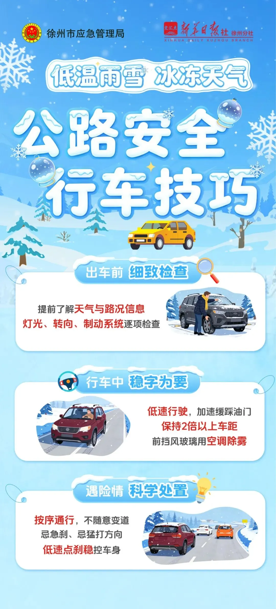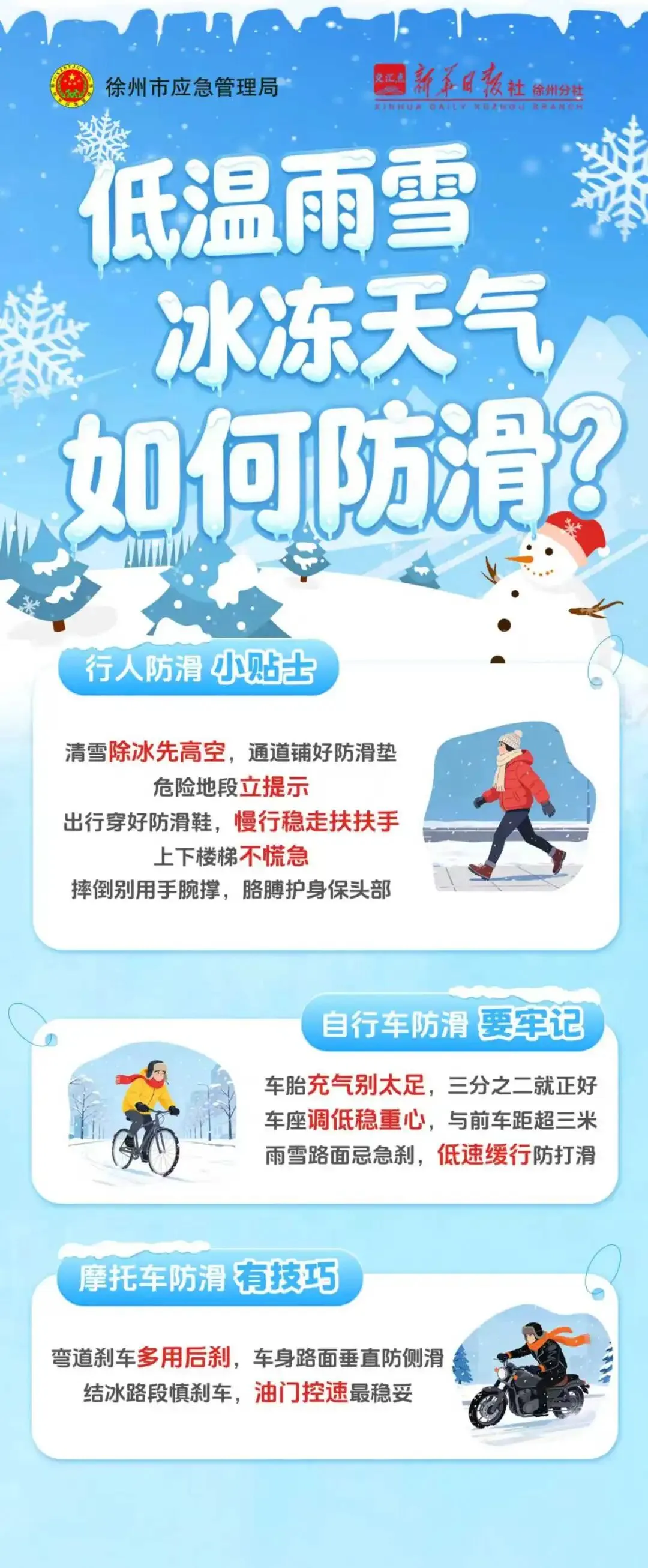 徐州市应急管理局联合新华日报社徐州分社,联合推出出行安全指南,涵盖公路安全行车技巧及行人、自行车、摩托车防滑要点。行车需减速慢行、保持安全车距,避开结冰路面与积雪路段;行人穿防滑鞋小步挪行,骑行者减少外出,忌急加速、急刹车。