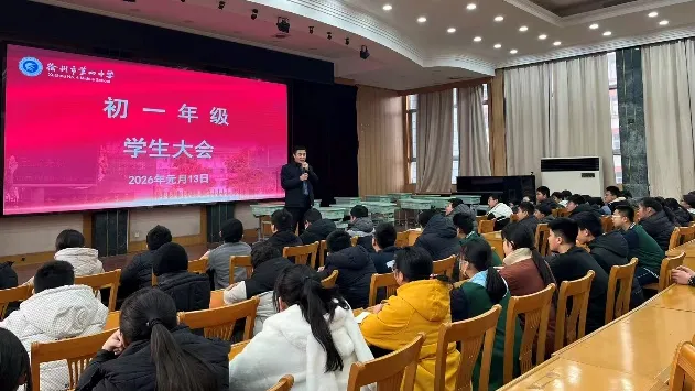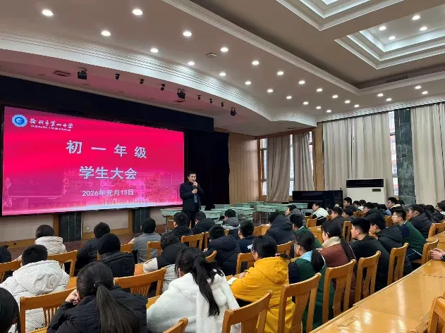 为落实学生核心素养发展,帮助初一年级学子夯实基础、掌握科学方法、激发成长内驱力,2026年1月13日,徐州市第四中学召开初一年级学生大会。会议由初一年级处李广东主任主持,学校党支部副书记胡传辉同志主讲,为同学们带来了一堂既富思想引领又具实践意义的成长赋能课。