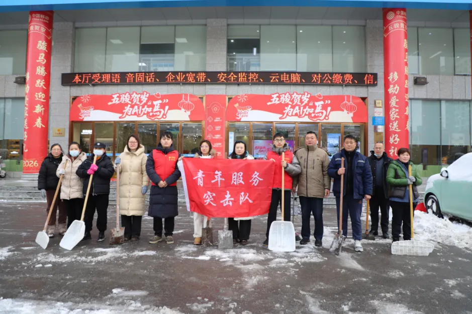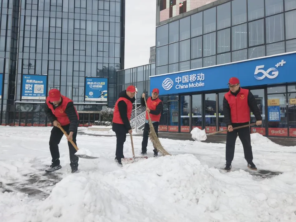 徐州移动团委第一时间组织青年突击队参与扫雪除冰工作,守护市民平安出行。青年突击队队员们手持铁锹、扫帚,分工协作、干劲十足。铲雪、推雪、清扫路面,一道道身影在风雪中忙碌穿梭,全力清扫公司门前的主干道积雪,确保道路畅通。