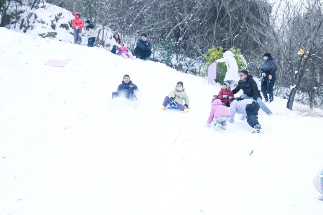 人手一个滑雪板,没有专业工具的,一块爬爬垫,游泳圈,大盆都用上了,反正是只要能滑下来就行。