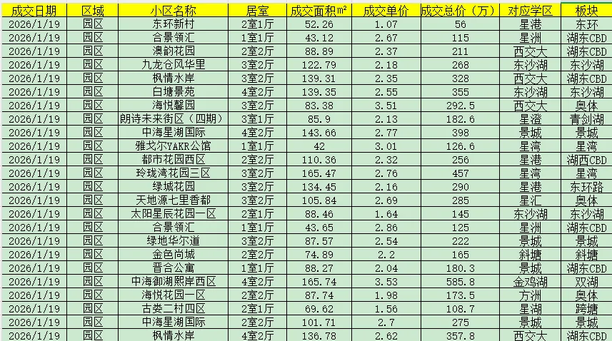 >苏州园区楼市1月19日交易数据