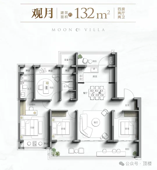👉洋房132㎡,约13.4米面宽·南北双阳台+飘窗赠送近20㎡·三开间阳台。