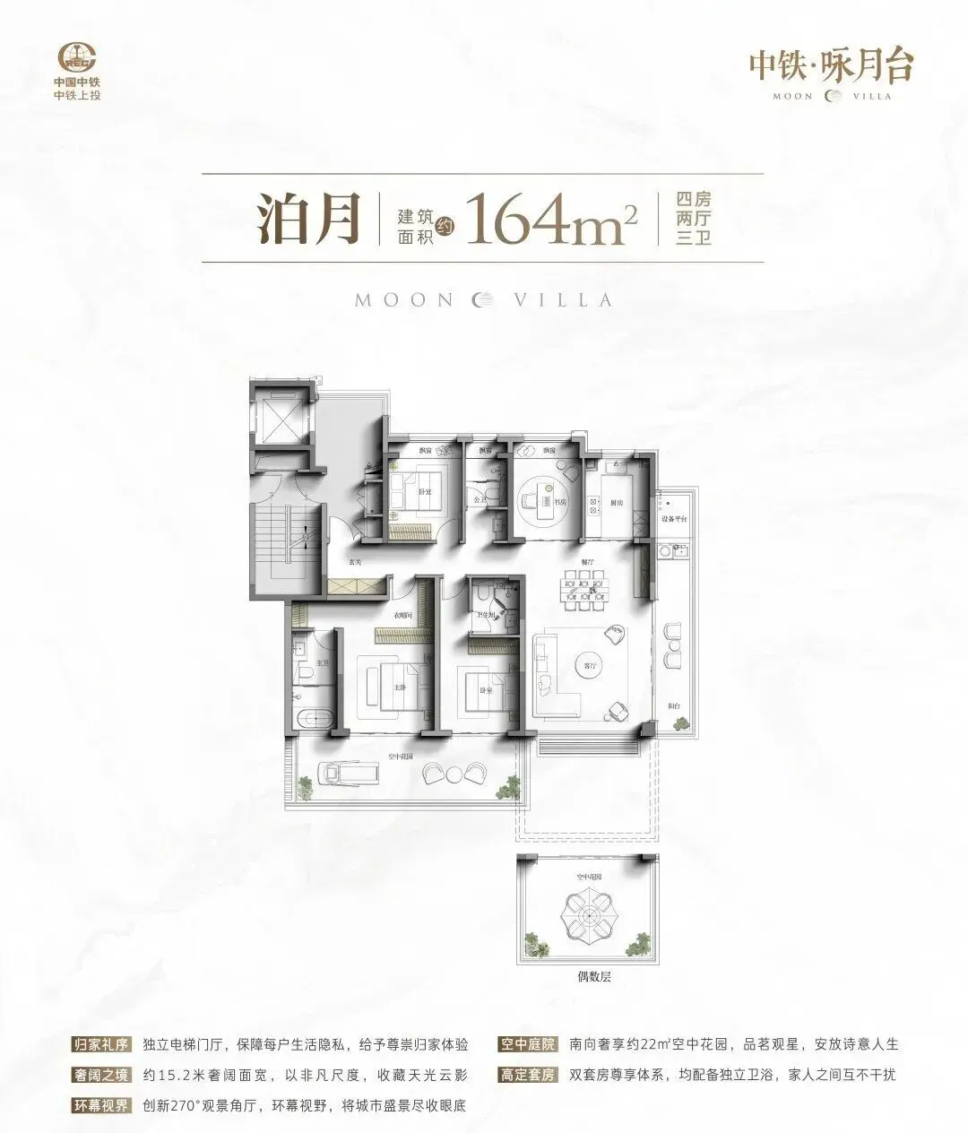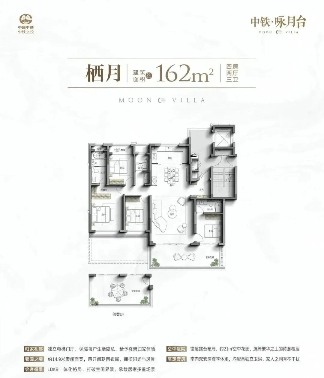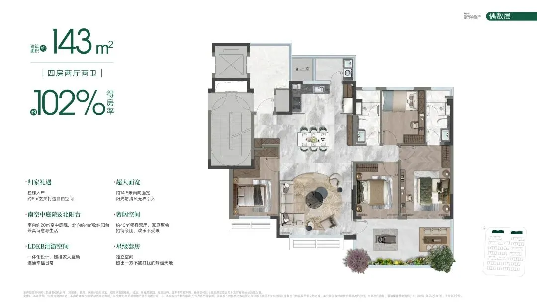 👉四代宅洋房162㎡4房2厅3卫,4开间朝南,并且做了南向双套房,奇数层与偶数层的区别就在于,空中庭院与客厅或卧室相连的区分。