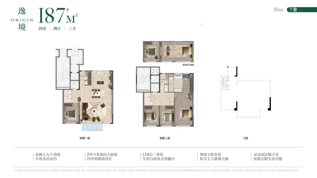 👉边户建面约186平,一层为前庭后院双入户与LDKG一体化;客厅上空是挑空空间,还有南向阳台,未来可打造为双套房设计。