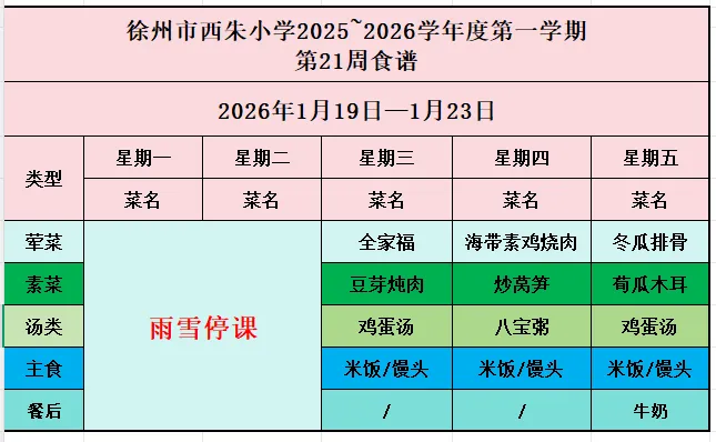 >徐州市西朱小学2025-2026学年度第一学期第21周食谱