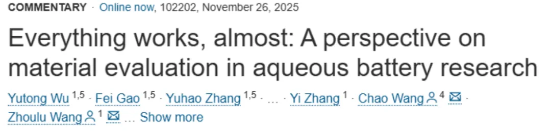 2025年11月,南京工业大学大学吴雨桐,汪舟鹭和扬州大学王超在《Joule》(IF=35.4)在线发表题为《Everything works, almost: A perspective on material evaluation in aqueous battery research》的评论。