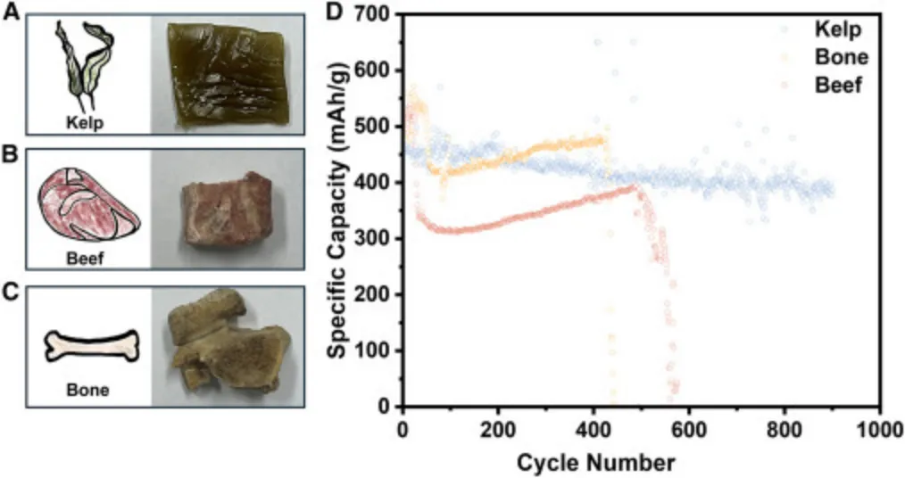 本研究进一步探索了猪骨、海带及牛肉等非常规集流体的应用。经适度修整后,上述天然基底被直接用作电极载体,组装为烧杯型电池,完全取代传统的铜/锡箔集流体,且未引入任何氧化锌活性物质或电极添加剂。此类替代性构型在400次循环中表现出稳定的充放电循环性能,比容量可达500 mAh g⁻¹。然而,其长期循环稳定性仍低于含电极添加剂的体系,该差异可能与仿生集流体自身的结构稳定性不足及其在运行过程中的逐步降解行为密切相关。