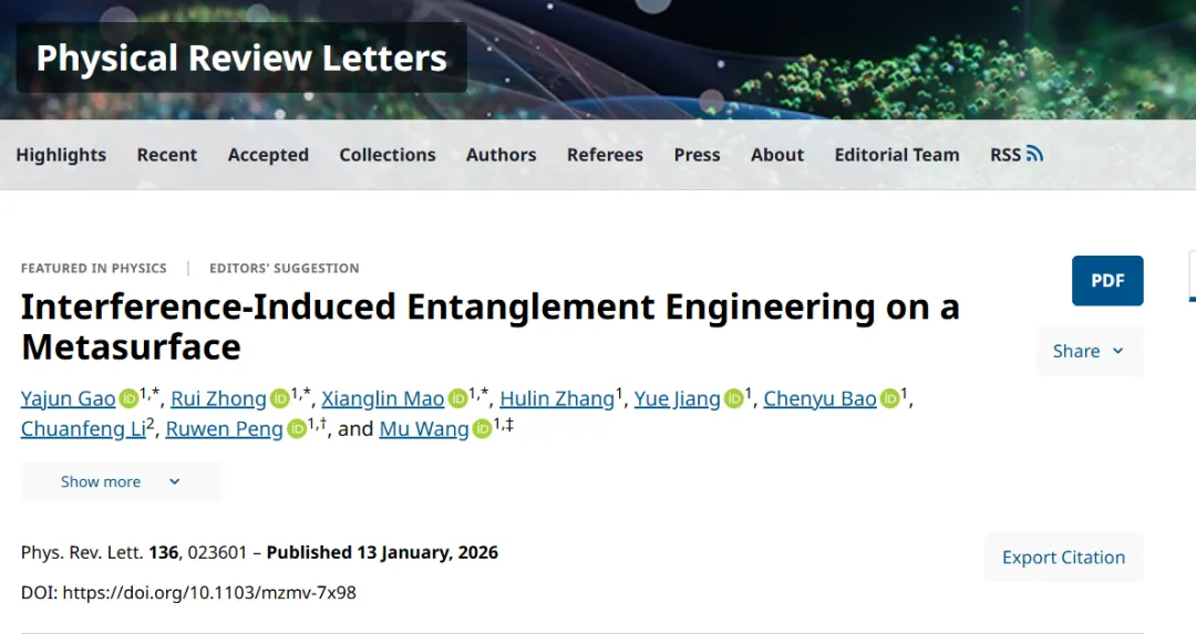 研究成果于2026年1月13日以题为“Interference-Induced Entanglement Engineering on a Metasurface”发表在《Physical Review Letters》上。