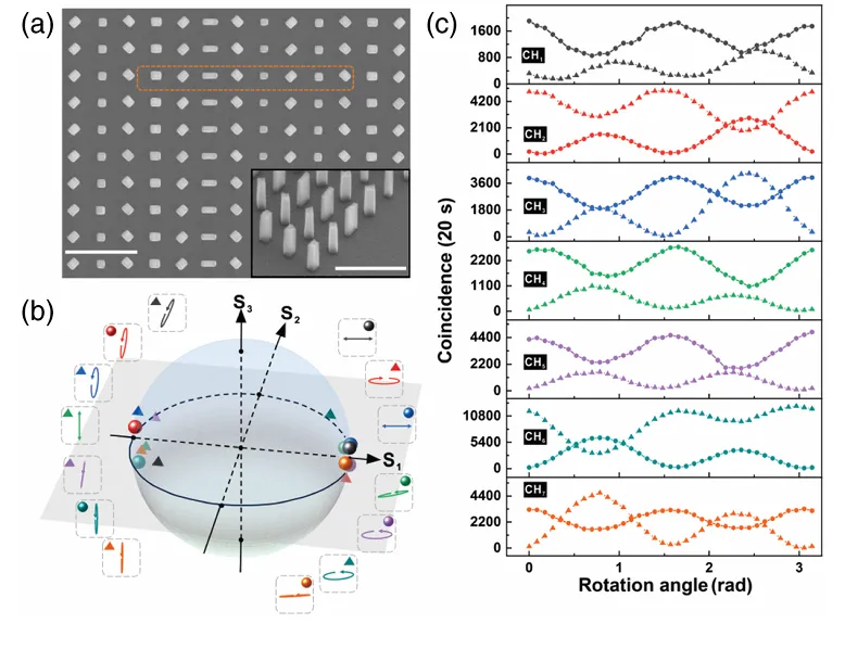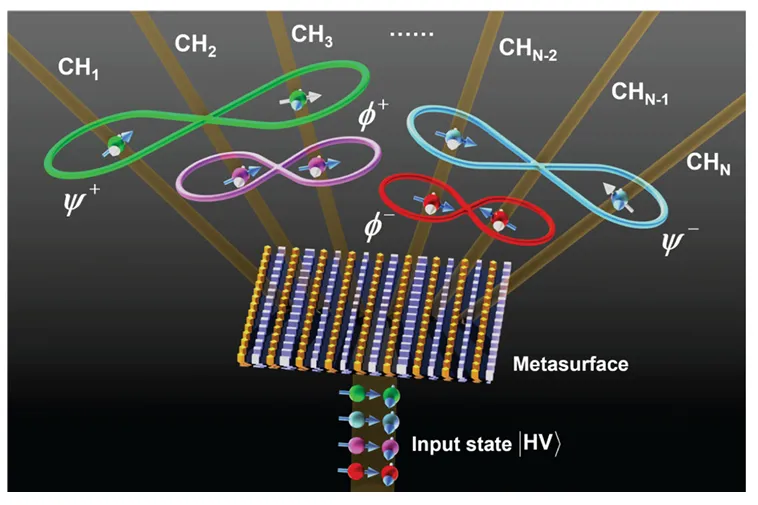 南京大学彭茹雯教授、王牧教授团队提出了一种全新的集成化纠缠工程方案,旨在解决量子系统小型化与集成化的核心难题。该团队设计了一种具有几何尺度诱导相位梯度的多通道超表面,通过双光子量子干涉与后选择相结合的原理来实现功能:将两个初始非纠缠、仅偏振态正交(如 |H⟩ 和 |V⟩)的全同光子入射到该超表面,其多通道结构(本工作中 N=7)使每个光子经历特定的偏振变换(通道 Jones 矩阵 Ĵ_m);当两光子路径不可区分时,其在不同输出通道对(共 N(N-1)/2 对)发生量子干涉,从而在后选择条件下主动生成偏振纠缠态。实验上,团队成功利用该单个超表面实现了四种贝尔态在全部21个通道对上的可控生成与分发,验证了超表面作为紧凑、可扩展量子纠缠源用于构建全连接量子网络的巨大潜力。