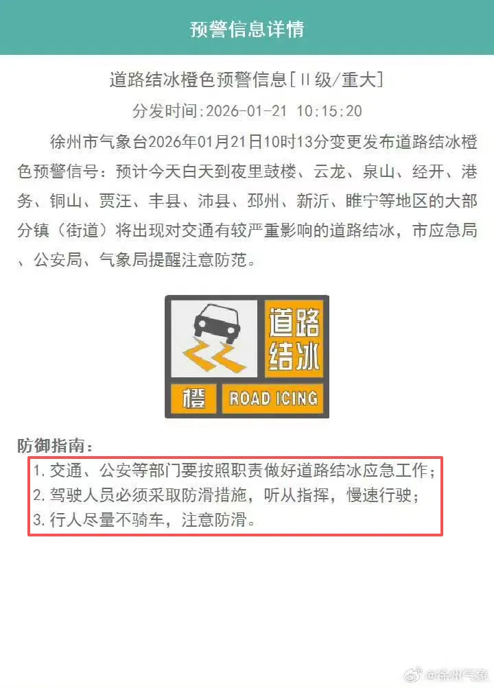 预计未来24小时南京、徐州、常州、连云港、淮安、盐城、扬州、镇江、泰州、宿迁将出现对交通有影响的道路结冰,其中徐州影响较为严重。