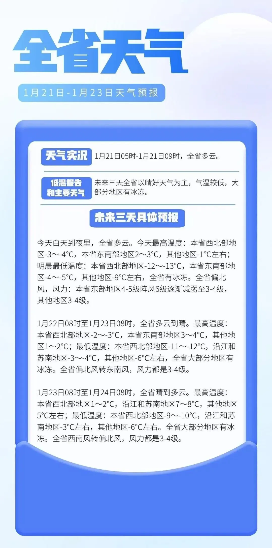 今天白天到夜里,全省多云。今天最高温度:本省西北部地区-3~-4℃,本省东南部地区2~3℃,其他地区-1℃左右;明晨最低温度:本省西北部地区-12~-13℃,本省东南部地区-4~-5℃,其他地区-9℃左右,全省有冰冻。全省偏北风,风力:本省东部地区4-5级阵风6级逐渐减弱至3-4级,其他地区3-4级。