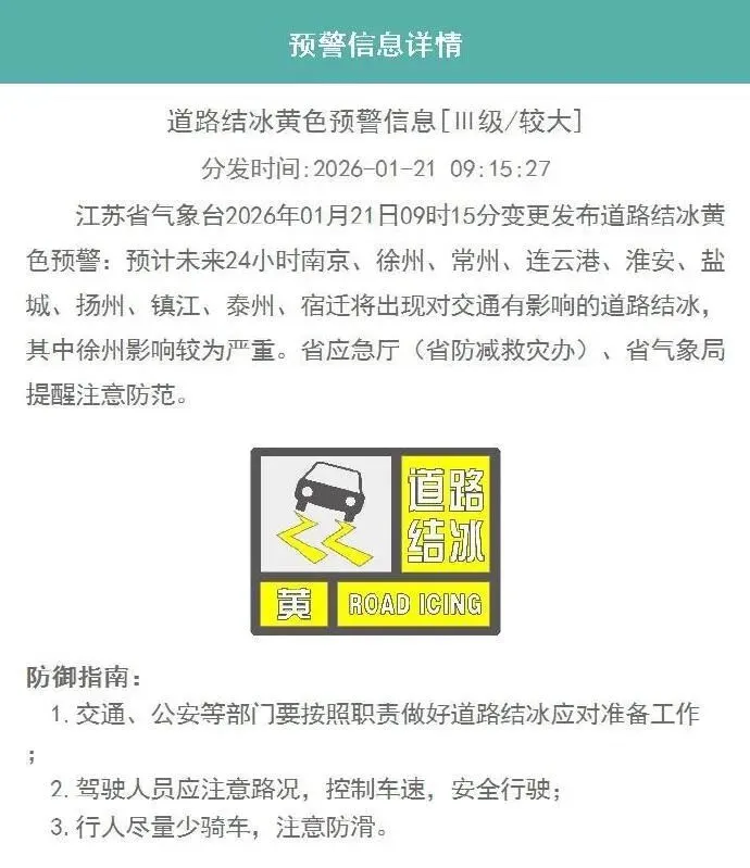 此前,江苏省气象变更发布道路结冰黄色预警:
