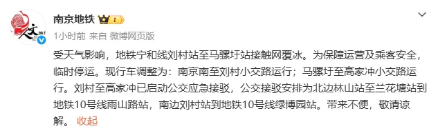 受天气影响,地铁宁和线刘村站至马骡圩站接触网覆冰。为保障运营及乘客安全,临时停运。