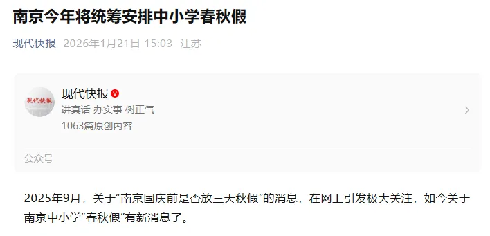 此次南京市政府工作报告中的上述工作部署,意味着今年起南京中小学有望拥有“春秋假”。