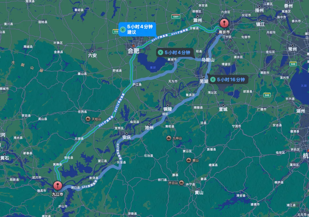南京至九江的现有路线主要有两条,要么通过G40绕道合肥,再转G3京台高速、G4212合安高速、G50沪渝高速、G70福银高速抵达九江。要么沿着长江南岸,经马鞍山、芜湖、铜陵、池州、安庆最终抵达九江。