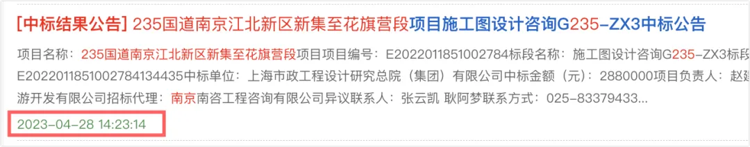 235国道南京江北新区新集至花旗营段工程在2023年的时候就已经完成了施工图设计咨询的中标。