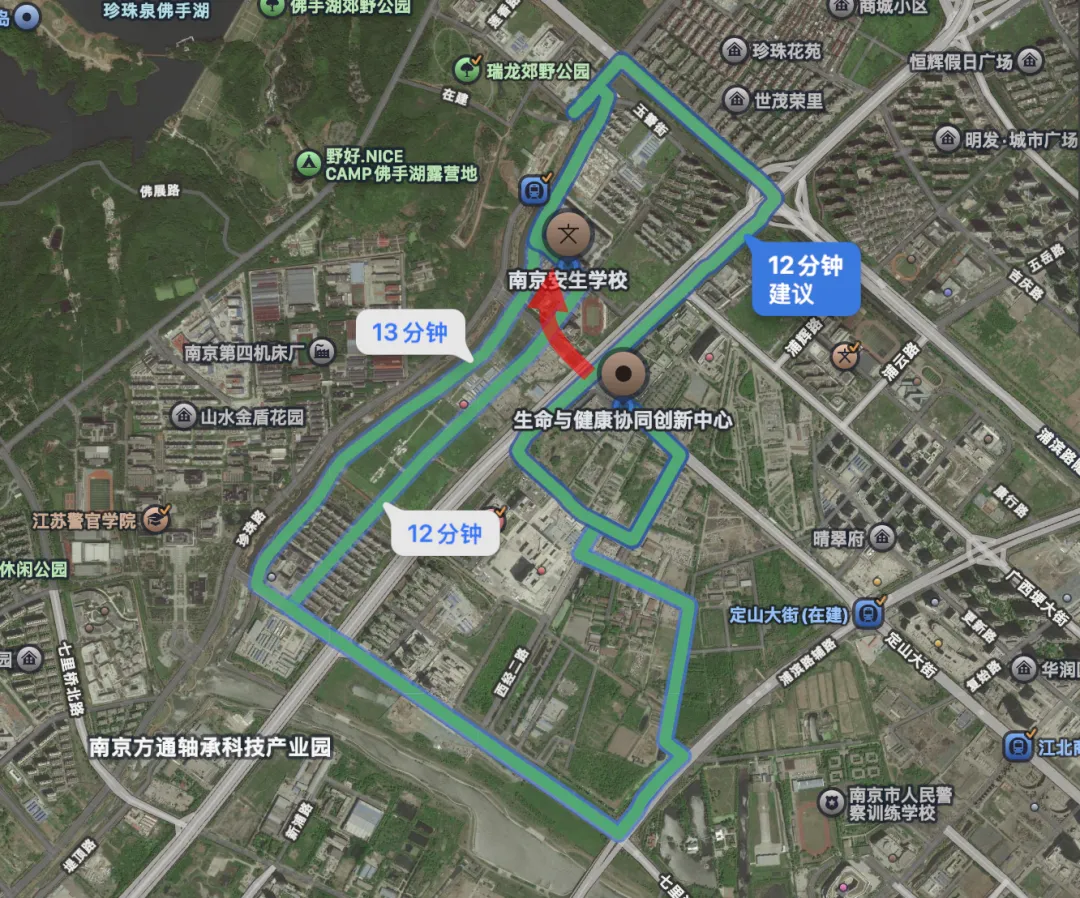 从生命与健康协同创新中心到马路对面的安生学校,现有的交通逻辑要绕一圈,效率比较低。另外鼓楼医院江北院区就在附近,辅路平时的交通压力也比较大,如果从马路这边到那边都需要这样兜一圈,显然未来的交通状况不太乐观。