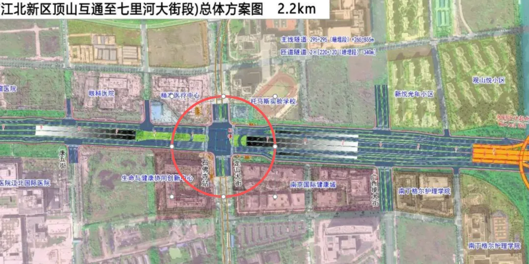 另外定山大街又是江北的发展主轴,当下的不连贯性确实也十分不利。解决的办法很直接,就是让江北大道快速路在这个区间通过隧道的方式下穿过去,定山大街就可以从地面通到对面,并一直延伸到老山。