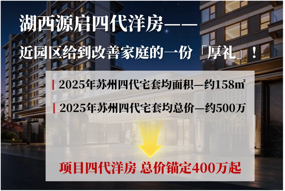 ▌不做大,只做好!约143㎡四代洋房!近园区独一份的友好尺度!我们知道,当下低密改善直奔大面积和高总价,已是大势所趋,尤其是四代宅这个领域。而湖西源启则专为改善打造了约143平四代洋房!光这个面积段,已经足够让改善买家一见钟情!再结合400万起的总价,那更是真正的人无我有——首先,去年四代宅套均面积已经达到150平+,直接将改善客群关在了低密的大门之外;其次,聚焦近园区板块四代宅产品,总价往往都在500万起步...