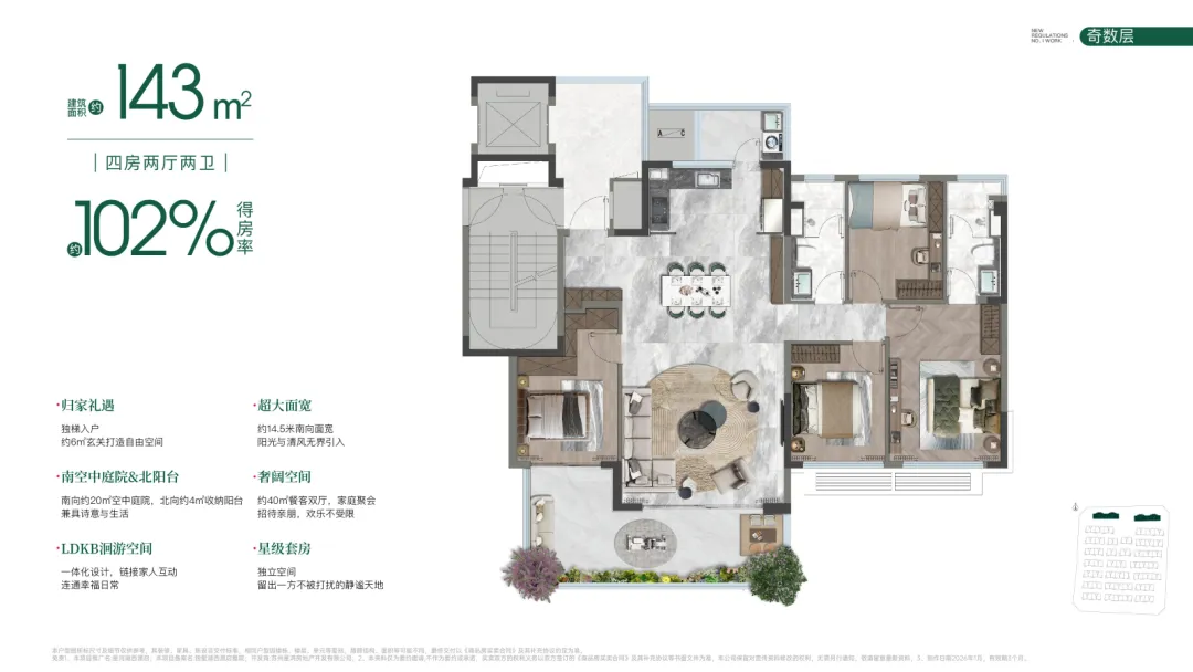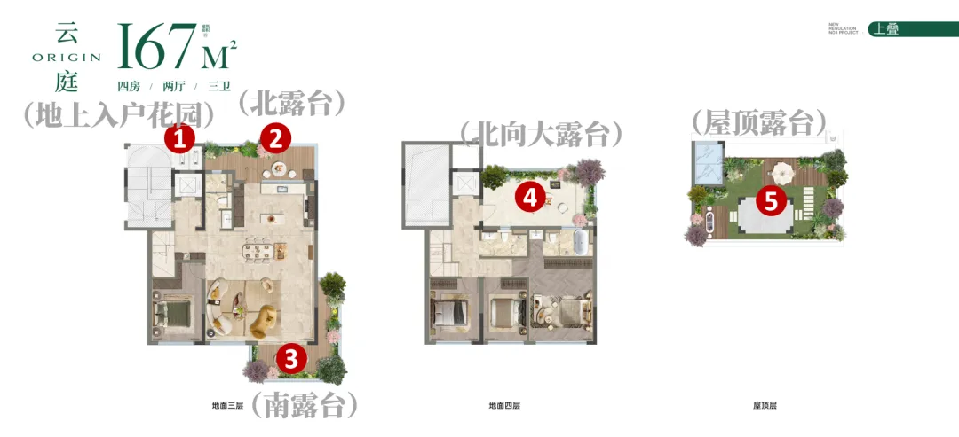 👉无敌高赠送!约155%使用率!做到真正有天有地联排的真正魅力必然在于院落生活!项目分别在上下叠配置了院子+多露台系统,得房率高达惊人的155%——约187平下叠户型实际可用面积能达到惊人近290平!其配置南北双花园,一层客餐厅与院子相连接,把亲地属性做到极;尤为巧妙的是,凭借社区整体抬升的基座,下叠的“地下空间”反而获得了堪比传统首层的通风与采光。加之约5.25米的挑高,即便打造双层空间,尺度依然在线。约167平上叠户型实际可使用面积可达约260㎡,其颠覆做到了5花园设计:包括入户花园、三层南北景观露台、四层北向景观露台、屋顶天空露台...垂直景观体系让上叠的空间感完全不输下叠~叠墅的买家,当然更重视家庭结构。