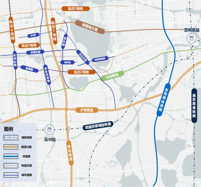 在交通层面,苏通湖城际铁路、通苏嘉甬铁路构建起1-1.5小时城际圈,常台高速、沪常高速贯通南北东西,中环南线与独墅湖南隧道的通车,将湖西南片区与园区的时空距离缩短至5分钟左右。加上轨交2、3、7号线的交织成网,助力湖西CCD实现了与苏州全城的高效连接。