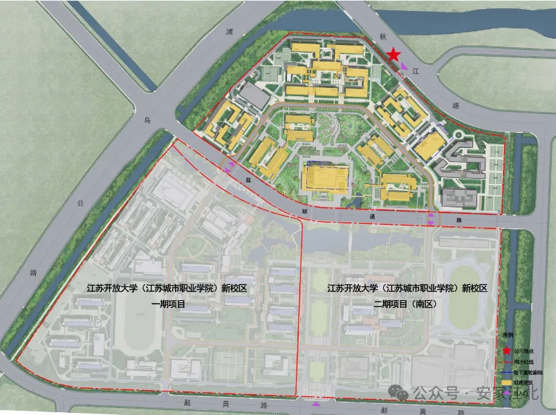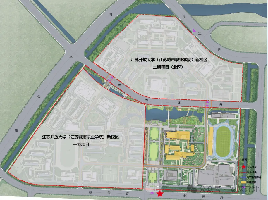 就在今天,江苏开放大学(江苏城市职业学院)新校区的二期项目批前公示正式出炉,项目分为南北两区。