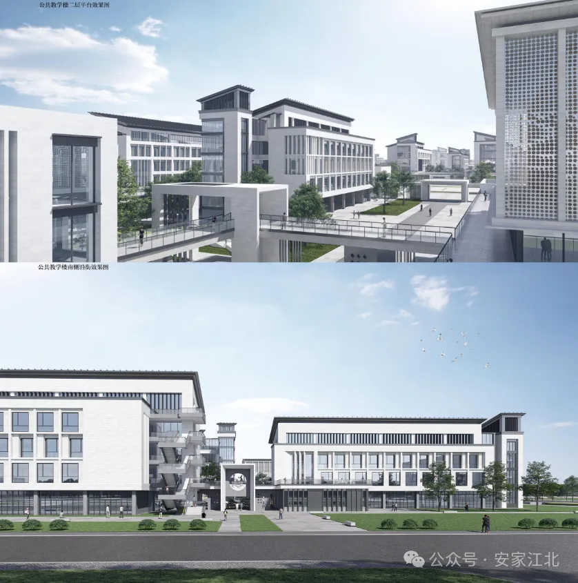 公共教学楼为浅色系建筑立面,搭配大面积玻璃,并且教学楼间用连梁相连接。