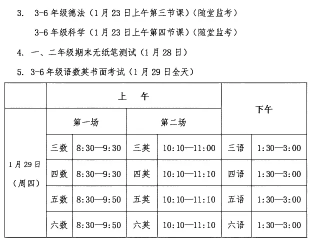 1月29日(周四):三、四、五年级考试