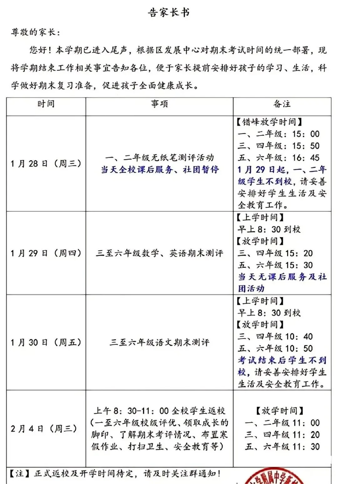 四五六年级:1月29日,一天考完语数外三门,部分学校30号考试