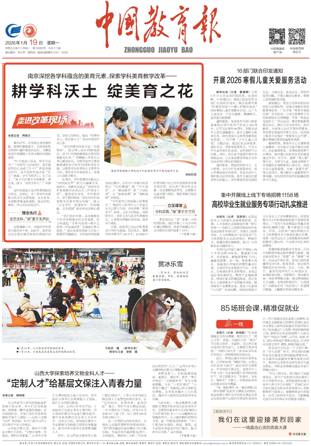 如何深挖各学科蕴含的美育元素?今天的“走进改革现场”专栏,一起来看南京的学科美育教学改革实践探索——南京深挖各学科蕴含的美育元素,探索学科美育教学改革——寒冬时节,冷风掠过南京颐和路,梧桐叶簌簌落下,在街道和附近校园中铺开斑驳的金色,也飘进南京市琅琊路小学语文教师刘锴的课堂。“叶子卷成小耳朵,听冬天说话。”“当你写下这句话时,是不是觉得自己也成了叶子?”听到刘锴这样问,而不是简单地点评“拟人”修辞,学生笑得开心,点了点头。“孩子们在真实中发现美、表达美,成为‘美的当事人’。”刘锴说。这样的课堂正是学科美育的现实样态。在南京,中小学学科美育教学改革正全面推进,全员美育、全课程美育逐渐铺展,推动学校、教师、学生共同向美而行。南京市琅琊路小学的孩子们在语文学习中感受城市之美。学校供图