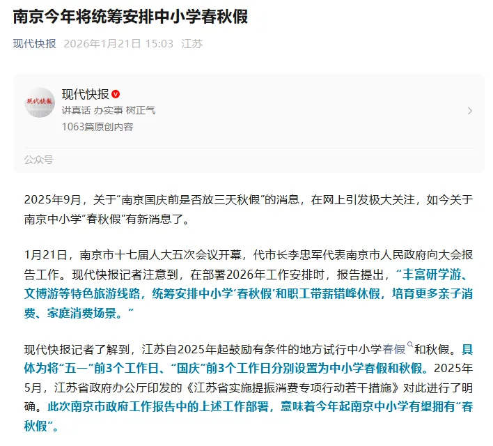 2025年5月,江苏省政府办公厅印发的《江苏省实施提振消费专项行动若干措施》对此进行了明确。此次南京市政府工作报告中的上述工作部署,意味着今年起南京中小学有望拥有“春秋假”。