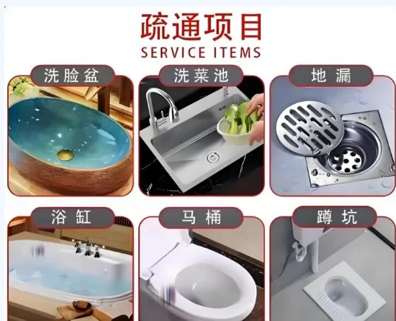 | 管道疏通 | 使用家用/大型疏通机,专业疏通各类疑难下水道、卫生间管道、地漏、浴缸、菜池、阴沟、马桶、蹲坑等 |