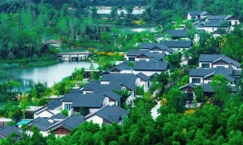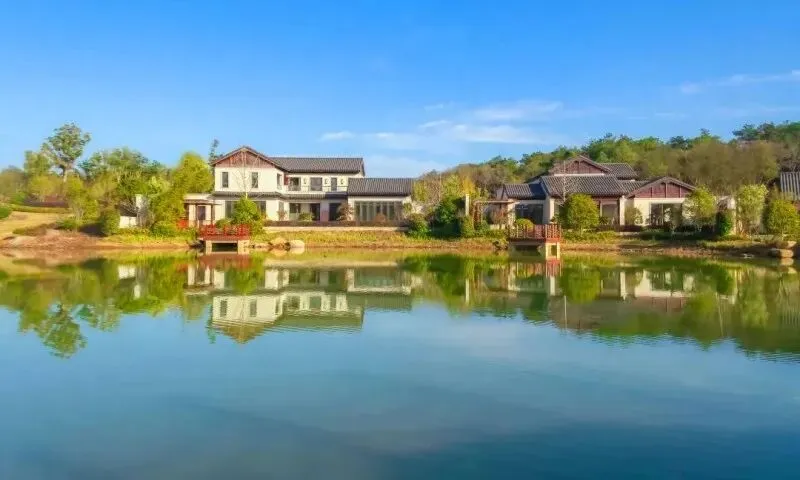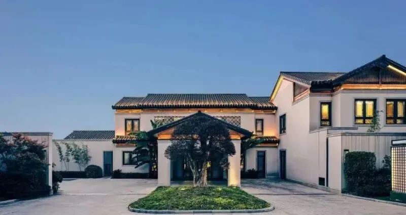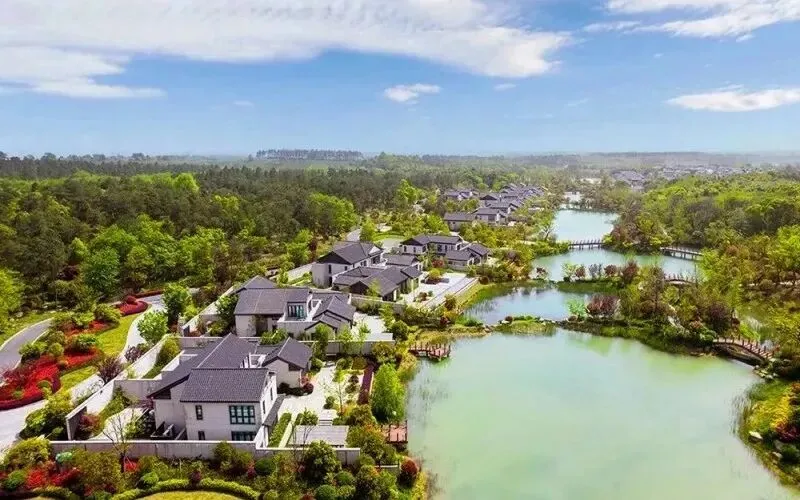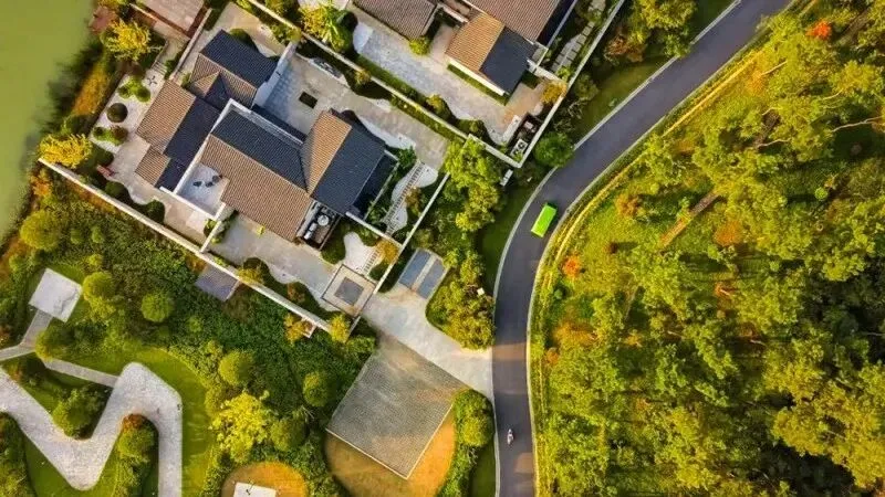 在这里,14个叠水湖自上而下蜿蜒,一幢幢别墅式大宅院,错落点缀在树木、湖泊间,整体建筑营造美学的雅致与意境, 融合东方禅境和江南写意,将中式庭院的雅韵婉婉道来。