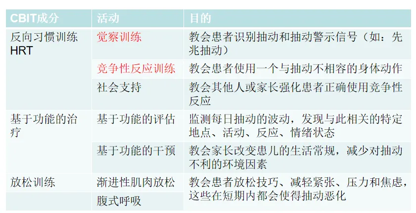 抽动障碍的综合行为干预(Comprehensive Behavioral Intervention for Tics)是一种非药物治疗,是以反向习惯训练、基于行为功能分析及放松训练三大模块组成的专门针对抽动障碍的综合性行为干预方法。临床研究显示CBIT治疗抽动的有效率达到87%,已经被美国、欧洲、加拿大等多个国家的抽动障碍临床指南推荐为一线治疗方法。