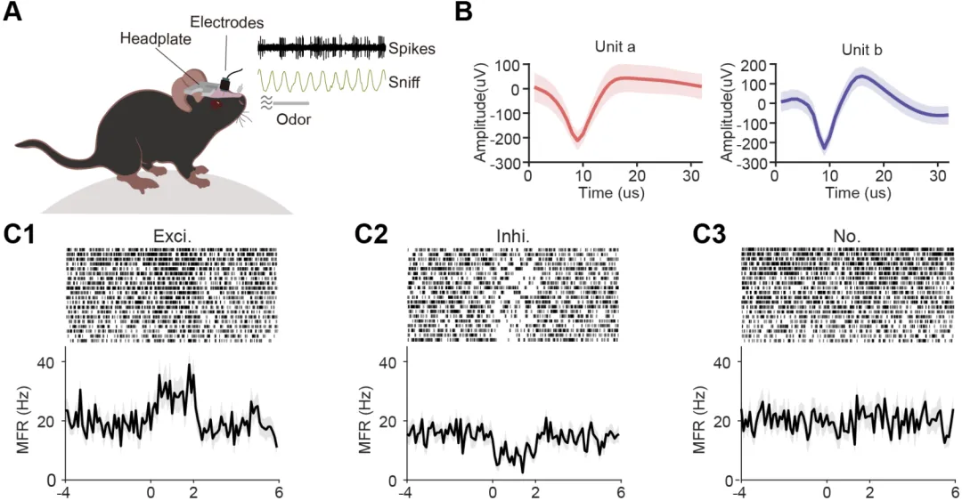 基于此,研究人员同时记录了清醒小鼠嗅球僧帽/丛状细胞(M/Ts)的胞外放电信号和动物的呼吸信号。