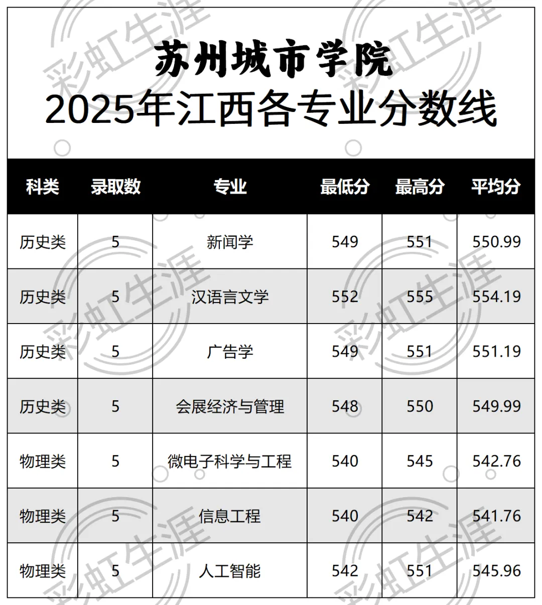 >苏州城市学院2025年江西各专业分数线