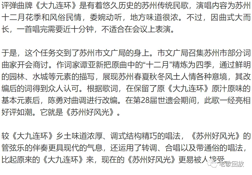 《苏州好风光》于2004年被确定为苏州市市歌。此曲由大九连环调《姑苏风光》(又名姑苏好风光)重新编配而成。