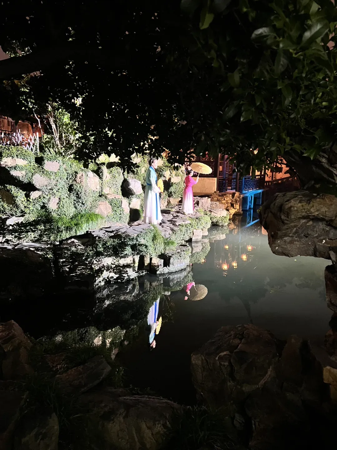 乐声悠扬,水面小船缓缓摇出,霓虹四处飞溅,假山后走出一对佳人开始对唱,就恍惚被带到了南宋年间,原来这造势造景还真是夜游乐趣,也就觉得一百多的门票算是值得。