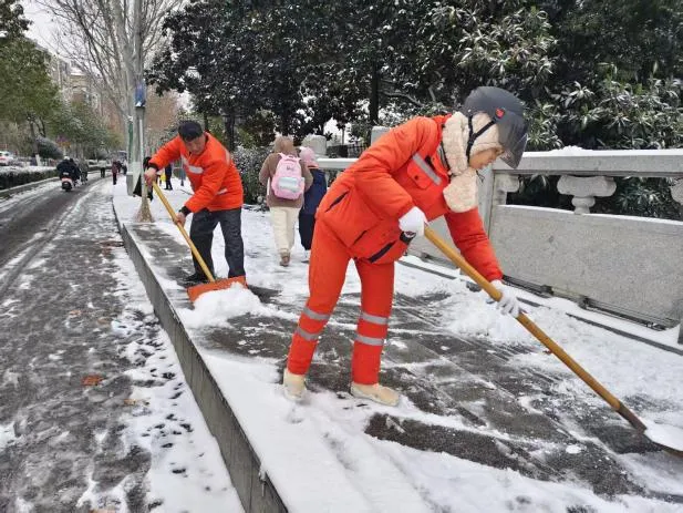 同样,溧水区785名环卫人员自19日夜间起便连续奋战15小时。他们采用“人工+机械”协同作业,在主次干道撒盐融雪,并在公厕、桥梁等关键点位铺设近千张防滑草垫,顺利完成城区及周边镇街的道路积雪清扫和防冻处理工作。