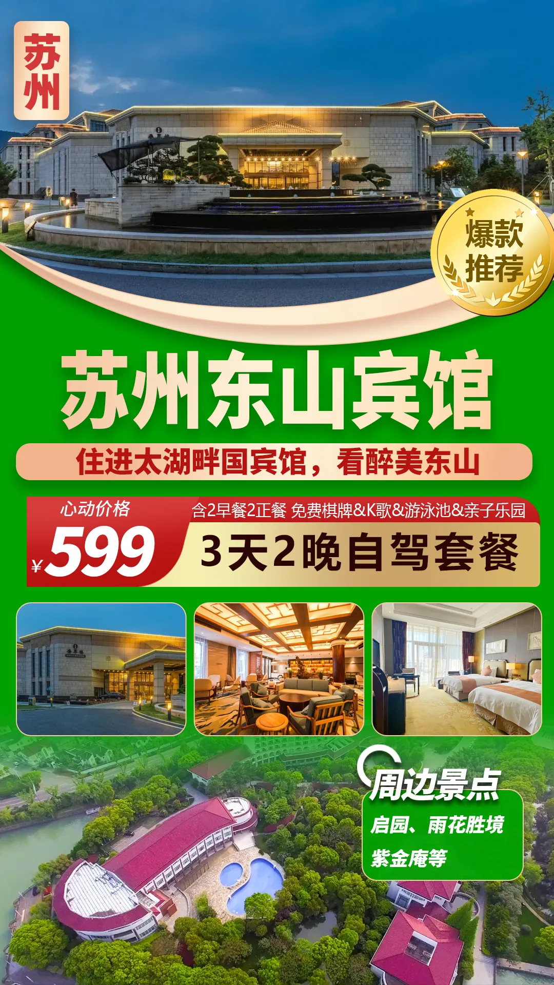 【苏州东山宾馆】住进太湖畔国宾馆,坐拥45万㎡花园美景,看醉美东山,宿叠翠楼园景房,窗外即美景!赠免费棋牌/k歌/泳池/亲子乐园